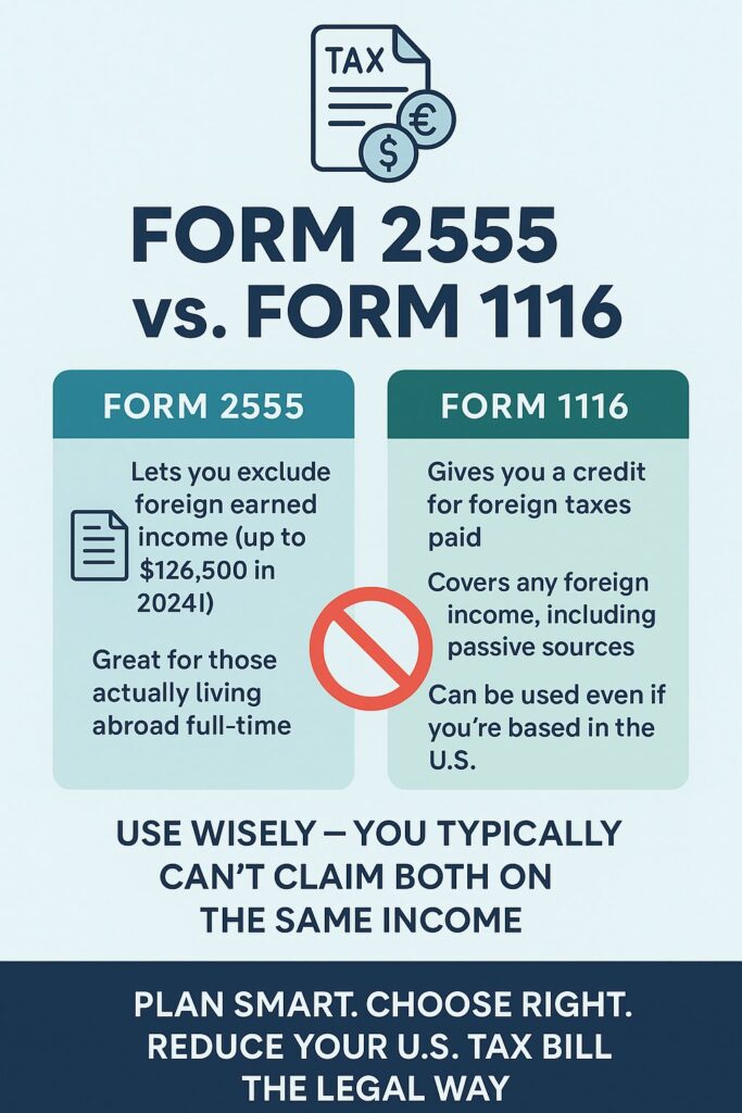 ๐Ÿ”น Form 2555: Must ๐ฅ๐ข๐ฏ๐ž ๐š๐ง๐ ๐ฐ๐จ๐ซ๐ค ๐š๐›๐ซ๐จ๐š๐ (330+ days or bona fide residence).