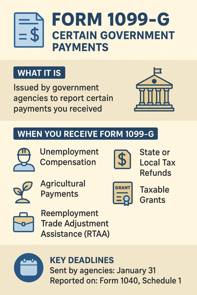 Form 1099-G is issued by federal, state, or local governments to taxpayers who received certain types of government payments during the year. It helps ensure that individuals report these amounts as income when filing their Form 1040 (U.S. Individual Income Tax Return).